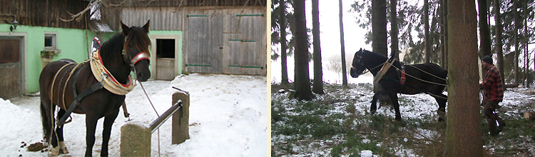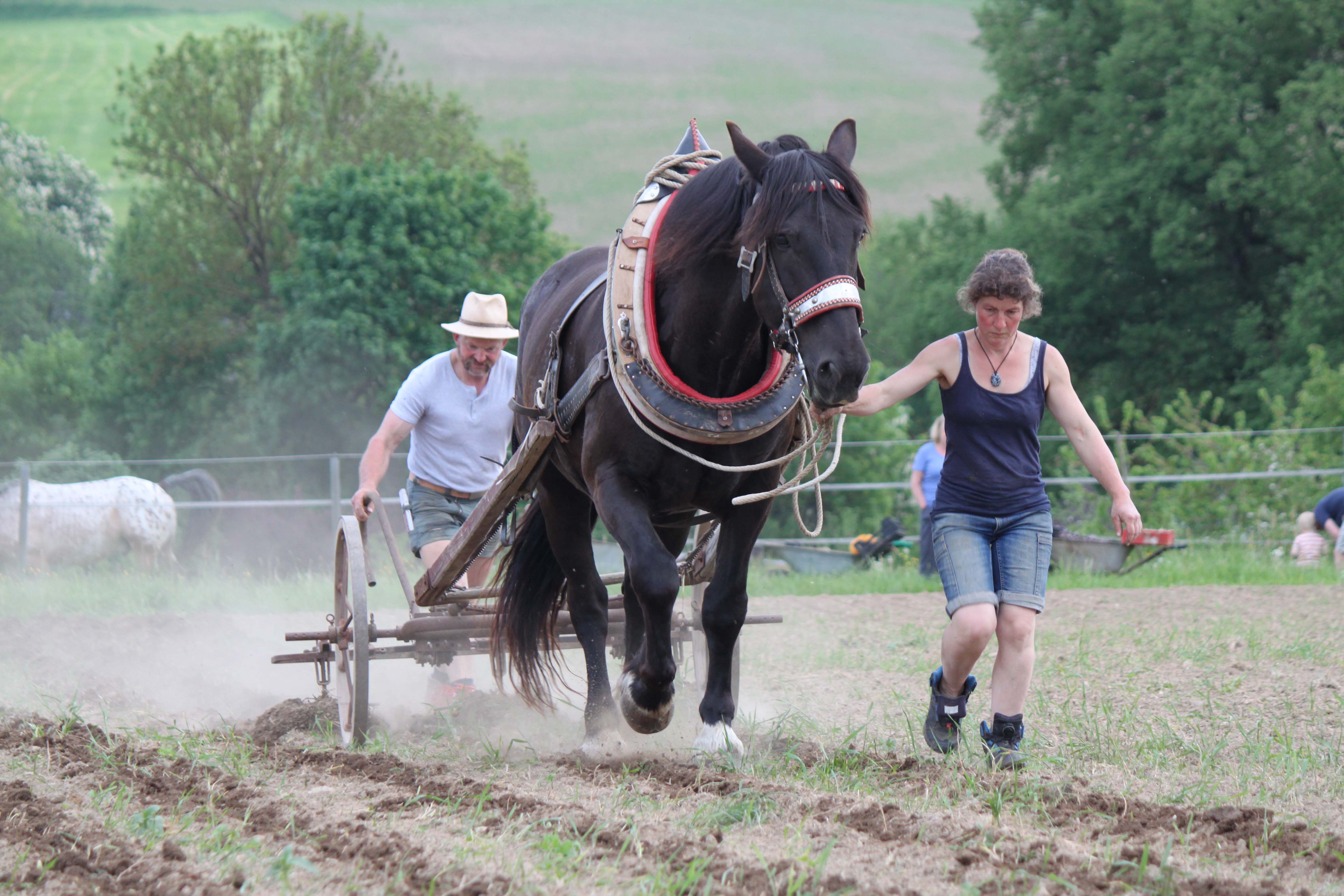 Wie zu Großvater's Zeiten bewirtschaften wir mit dem Pferd unseren Acker, auf dem wir Rüben, "Erpfl" (Kartoffeln) und anderes Gemüse (Kohl, Porree, Mangold ...) anbauen. Hierzu wurden alte Geräte, die vergessen in mancher Scheune lagerten, wieder zum Leben erweckt.